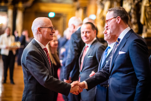 Rechtsanwalt Heiko Hecht, Honorarkonsul der Republik Armenien, im Gespräch mit dem 1. Bürgermeister der Freien und Hansestadt Hamburg im Kaisersaal des Rathauses. Anlass ist der jährliche Neujahrsempfang des Konsularkorps Hamburg.